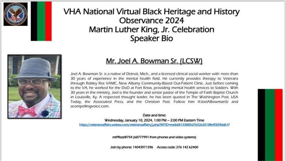 On Wednesday, January 10, 2024 @ 1:00pm EST, Joel had the honor of presenting the speech for the MLK celebration sponsored by the Veterans Health Administration. The recording can be viewed at the link below, with the password: JxPZ9ph?